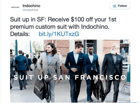 Tapping into local consumer culture is another powerful tactic. Custom tailoring advertisements, such as the location-specific suit promotion, establish a sense of exclusivity and belonging by directly referencing a specific region or city lifestyle.
